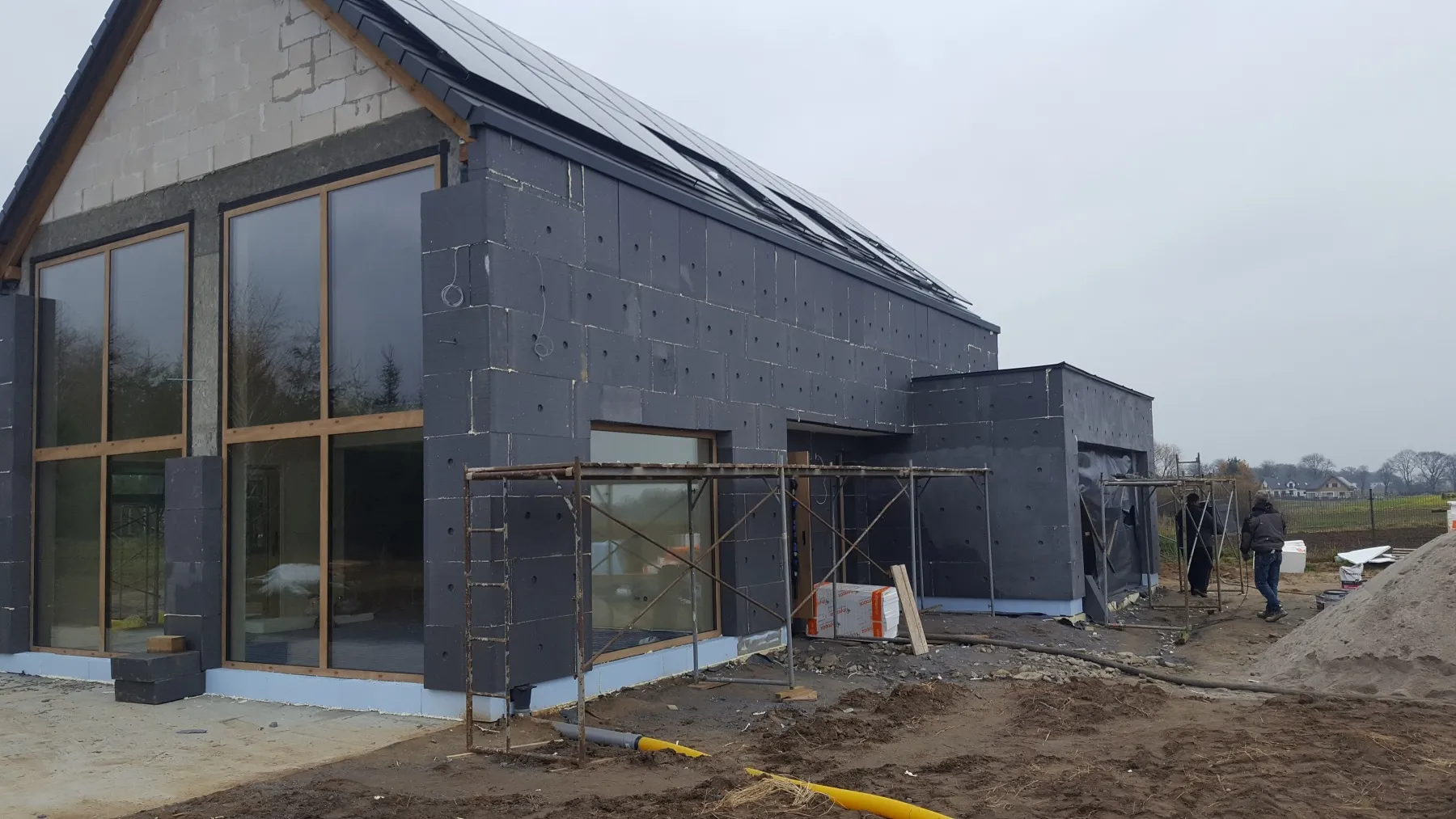 Izolația acoperișului clădirii a fost realizată cu spumă PUR de 22 cm grosime, iar pereții exteriori – cu polistiren grafitat de 20 cm grosime. Pentru finisarea fațadei clădirii a fost folosit tencuială siliconică, iar soclul a fost finisat cu tencuială mozaic.