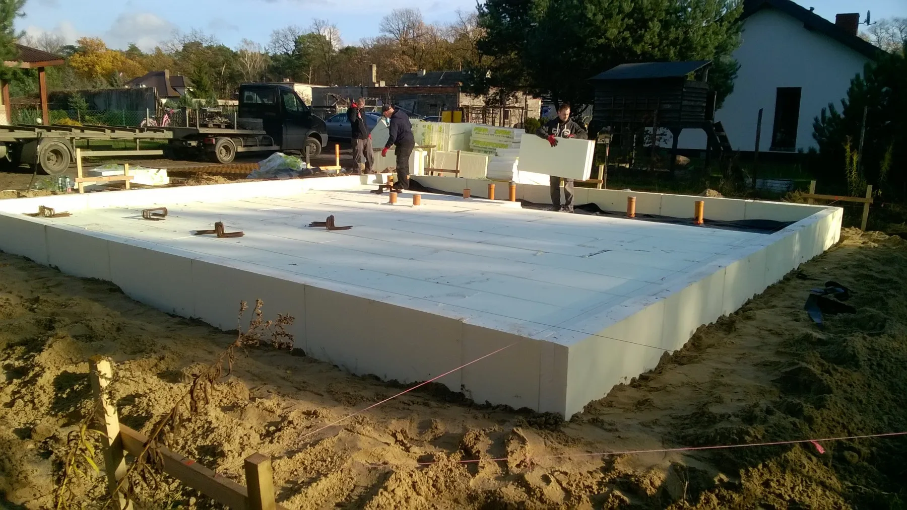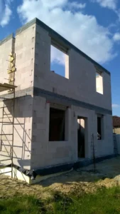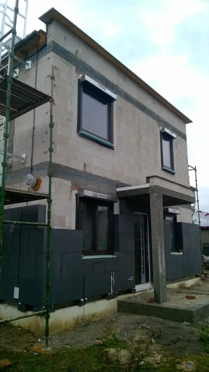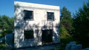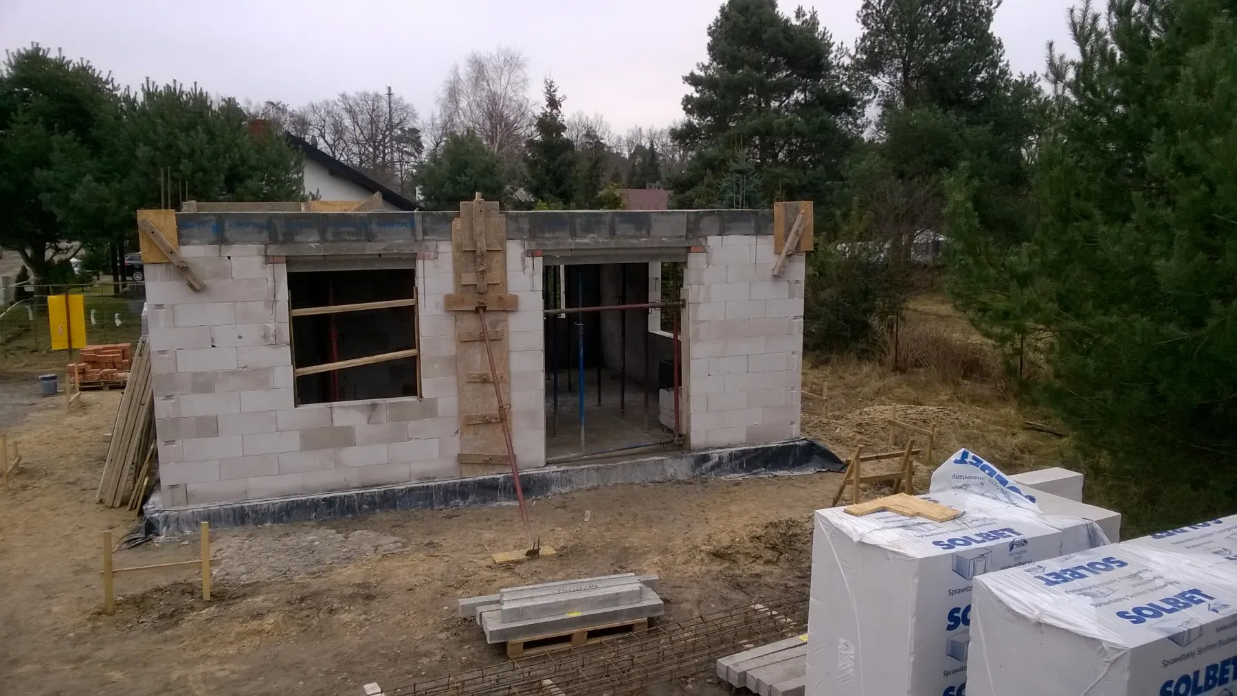 Casa eficientă energetic ridicată pe o placă de fundație armată. Pereții de susținere și despărțire au fost realizați din beton celular cu grosimea de 24 cm și, respectiv, 12 cm. Acoperișul plat al clădirii a fost acoperit cu folie bituminoasă de bază, polistiren EPS 100 + polistiren pentru pante conform proiectului și un alt strat de folie bituminoasă.