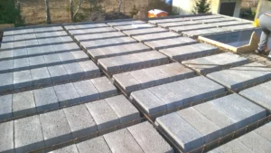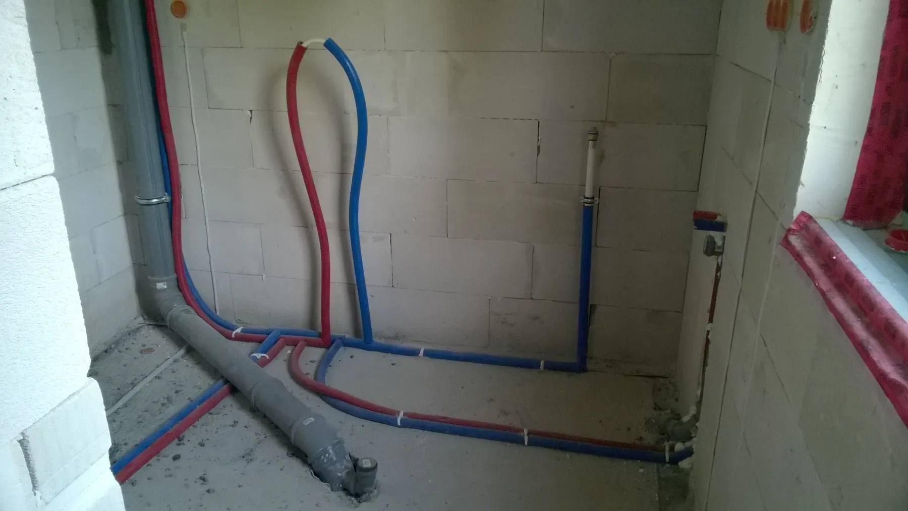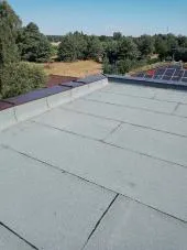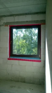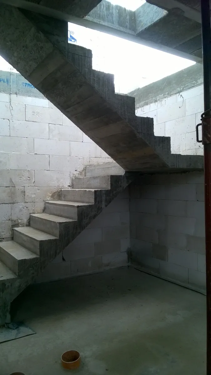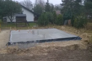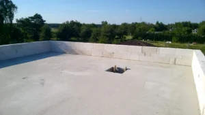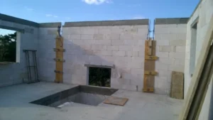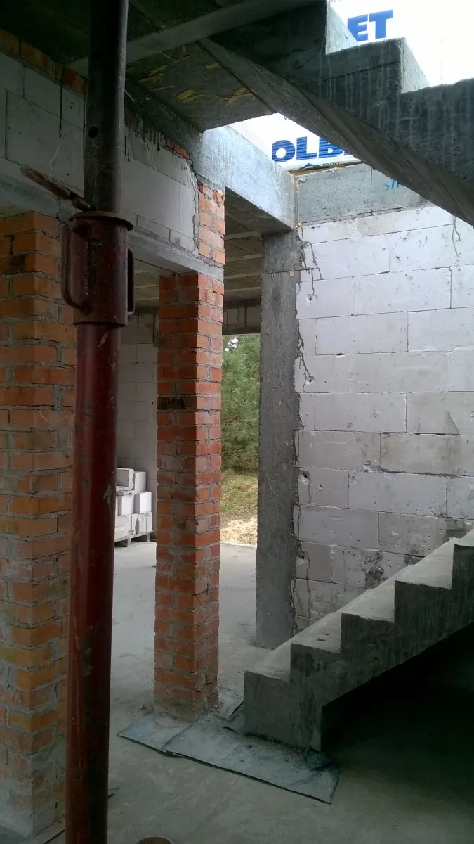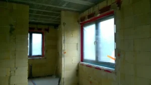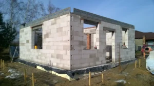 Casa eficientă energetic ridicată pe o placă de fundație armată. Pereții de susținere și despărțire au fost realizați din beton celular cu grosimea de 24 cm și, respectiv, 12 cm. Acoperișul plat al clădirii a fost acoperit cu folie bituminoasă de bază, polistiren EPS 100 + polistiren pentru pante conform proiectului și un alt strat de folie bituminoasă.