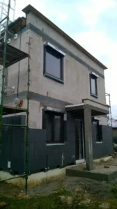 Izolarea pereților exteriori – cu polistiren gri grafit cu grosimea de 20 cm. Pentru finisarea fațadei clădirii s-a folosit tencuială siliconică.