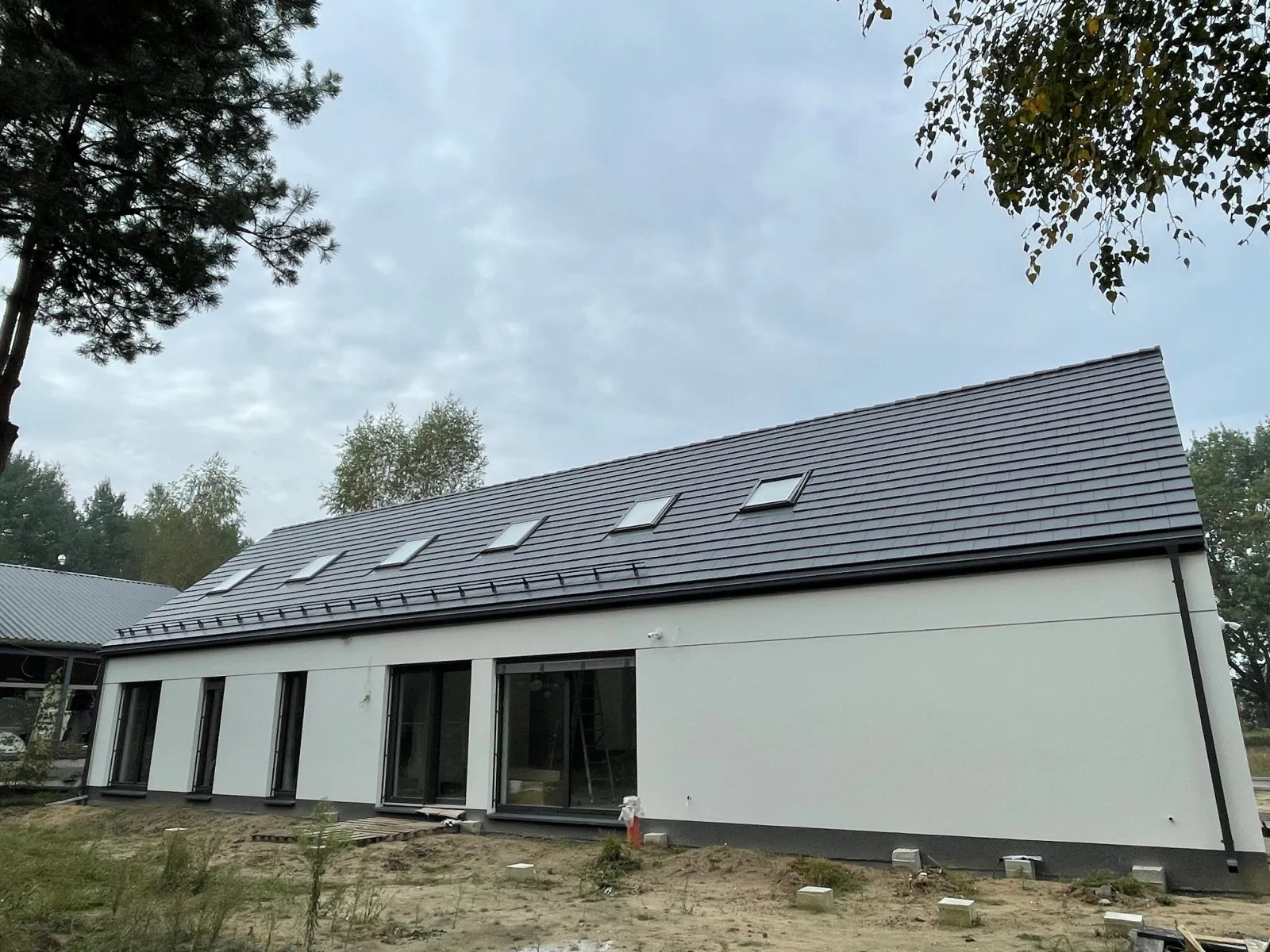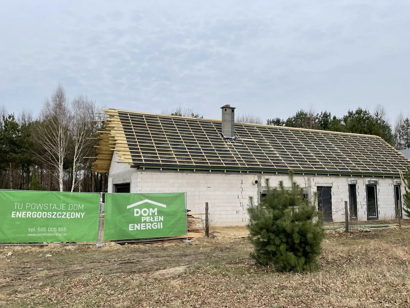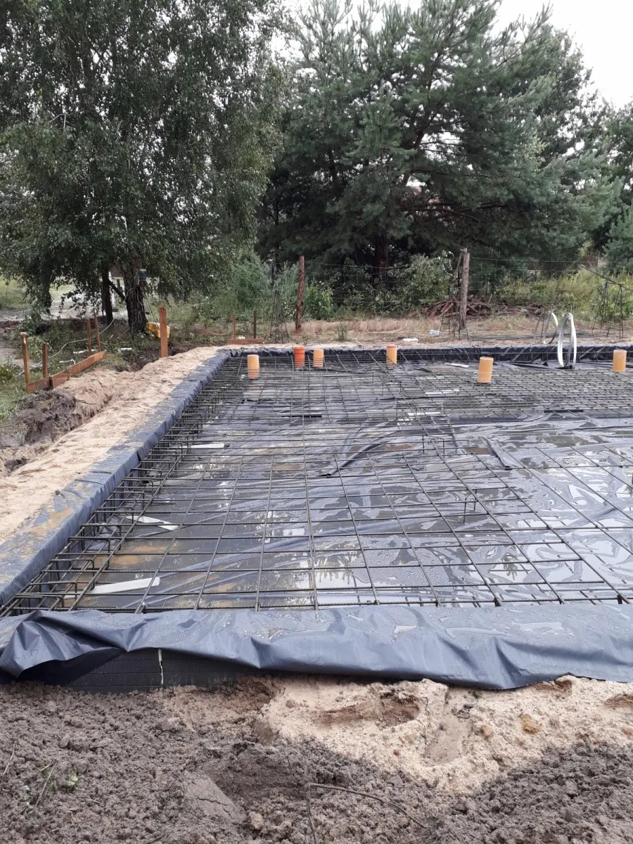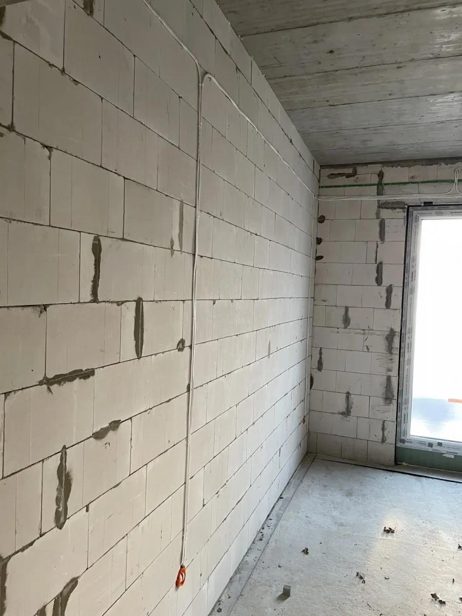 Casă cu o suprafață utilă de aproape 120 m2 ridicată pe o placă de fundament armată cu izolație termoeficientă din polistiren extrudat XPS 300 de 20 cm. Atât pereții portanți, cât și pereții despărțitori au fost realizați din blocuri silicat, cu mortar subțire de clasă M10. Structura acoperișului a fost realizată ca o construcție tradițională din lemn cu o plafon monolitic, acoperit cu țiglă de ciment Brass Teviva de culoare antracit. A fost instalat și tubul pentru alimentarea instalației fotovoltaice (PV).