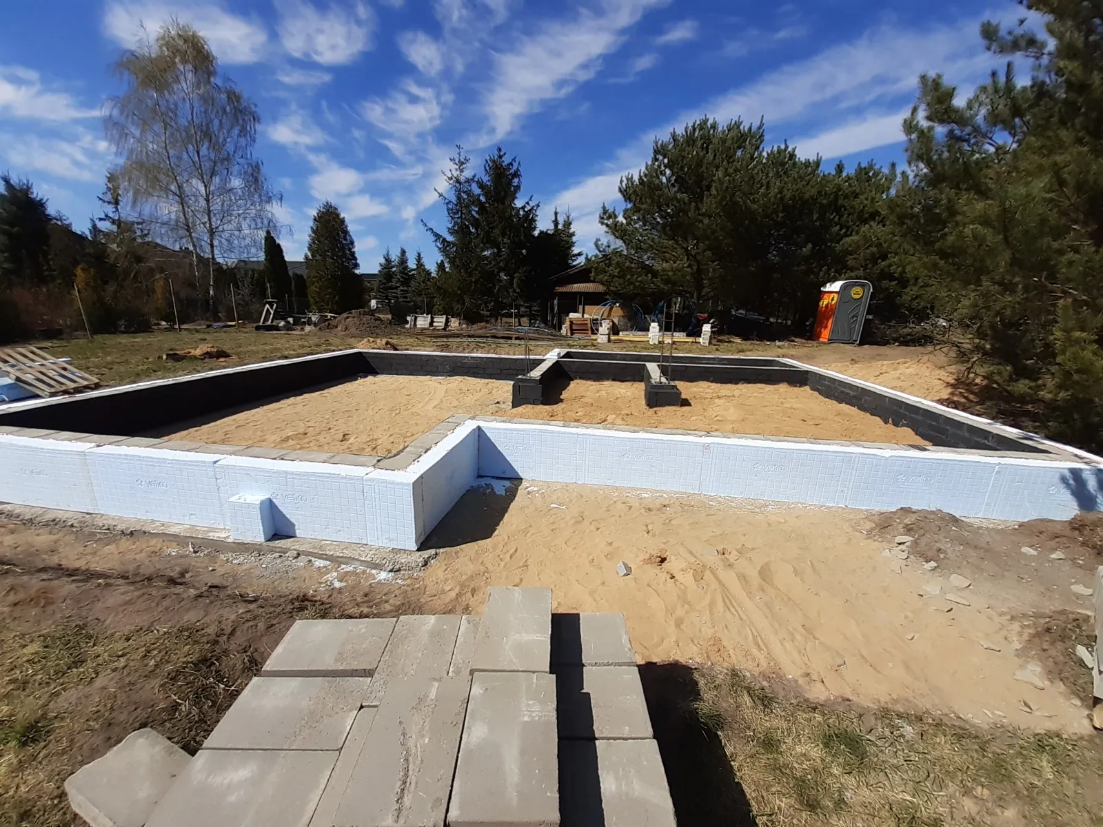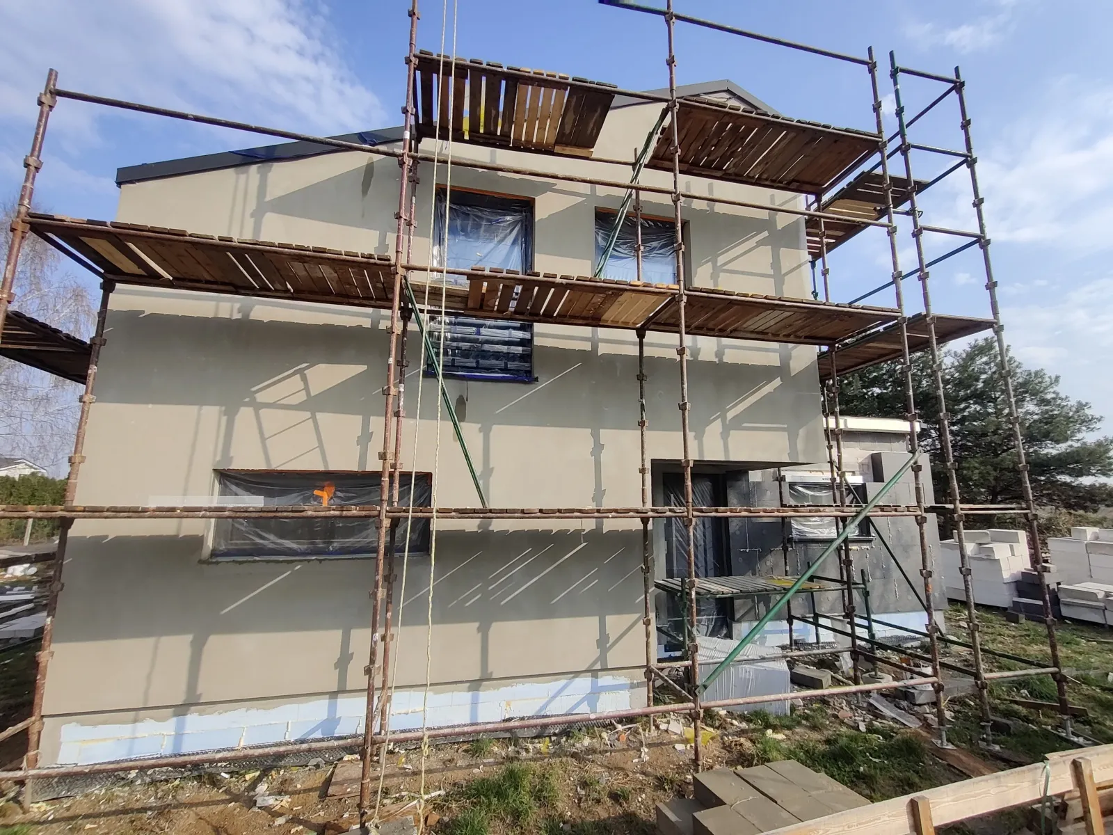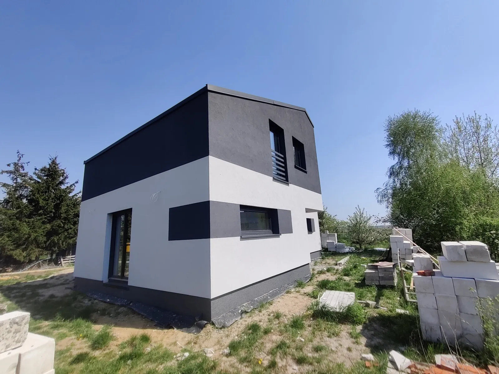 Izolarea acoperișului clădirii a fost realizată cu spumă poliuretanică (PUR) cu grosimea de 25 cm, pereții exteriori – cu polistiren grafitat de 20 cm grosime, iar zidurile de fundație – cu polistiren pentru fundații rezistent la apă EPS AQUA de 15 cm grosime. Pentru finisarea fațadei clădirii s-a folosit tencuială siliconică de culoare albă.