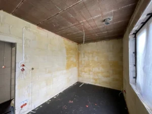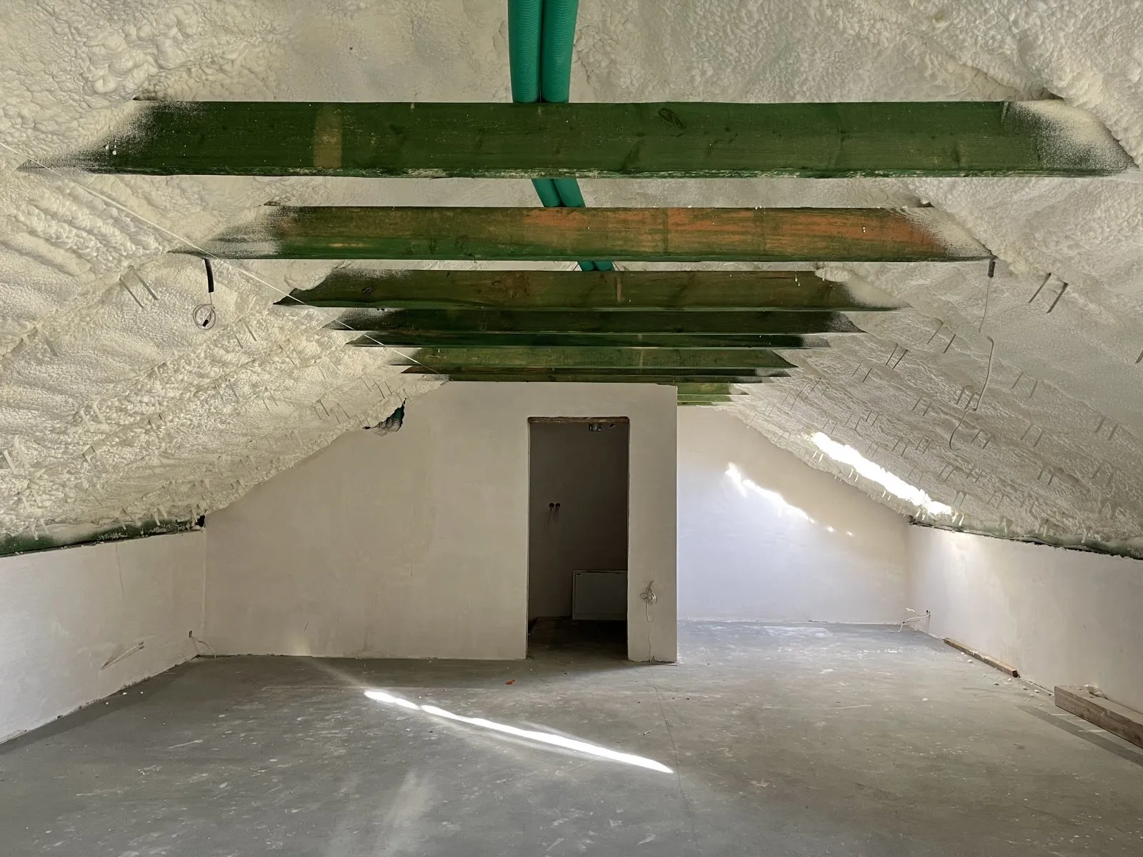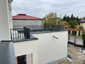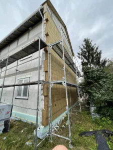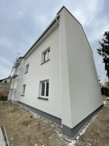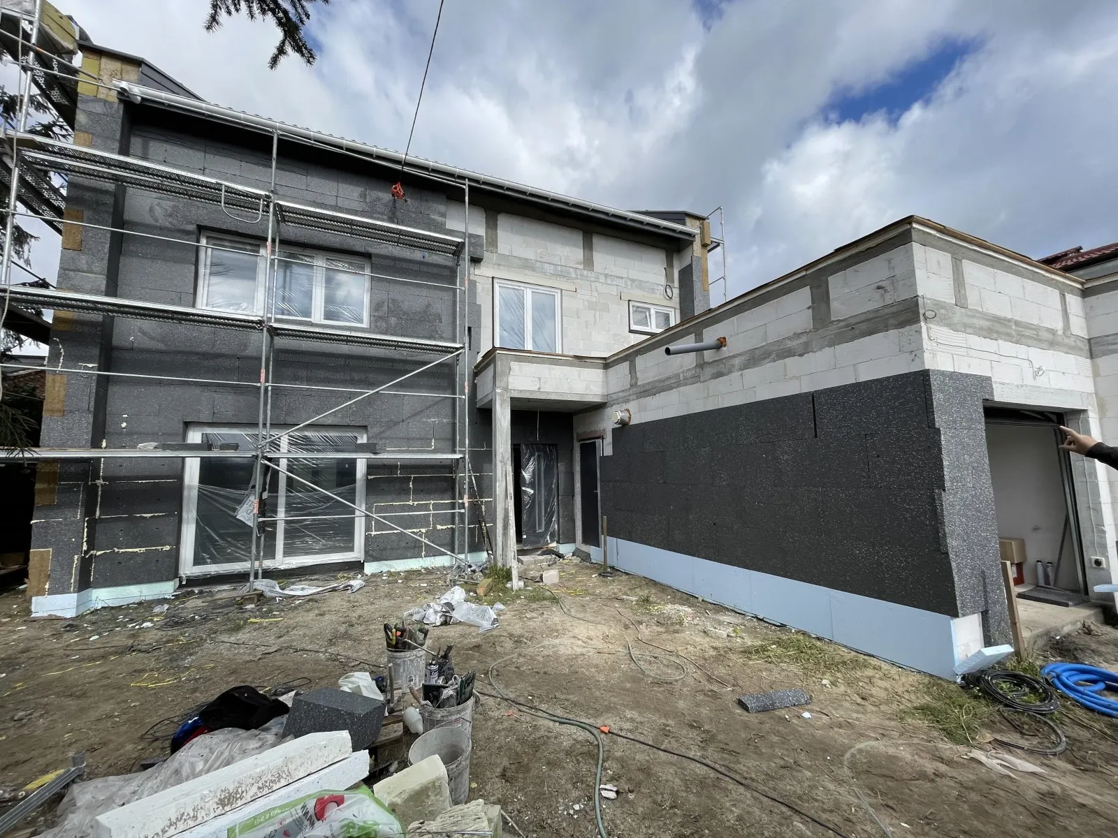 Pentru izolarea pereților exteriori a fost utilizat polistiren grafitat cu grosimea de 20 cm, iar pentru finisarea fațadei clădirii s-a folosit tencuială siloxanică de culoare albă.