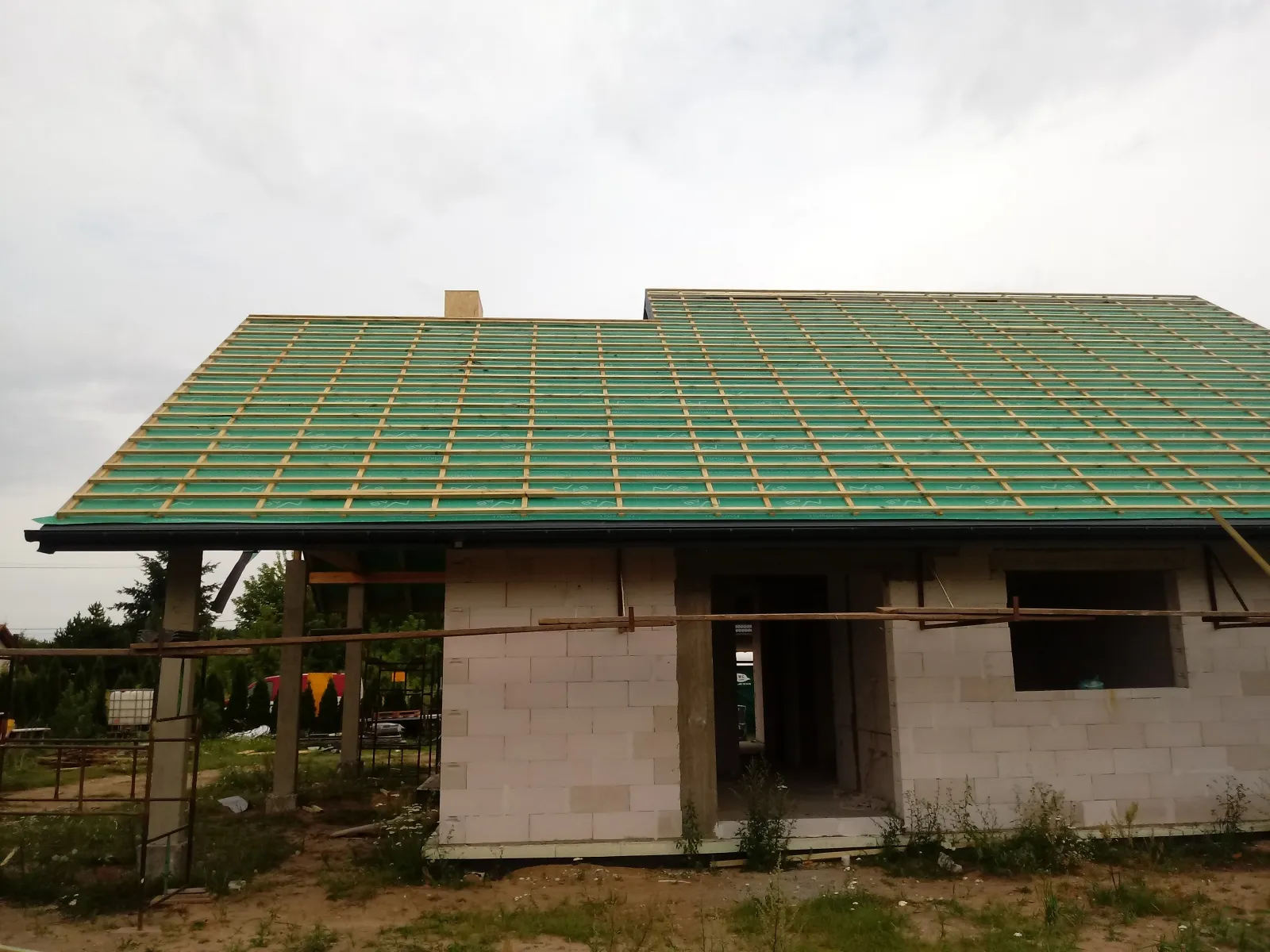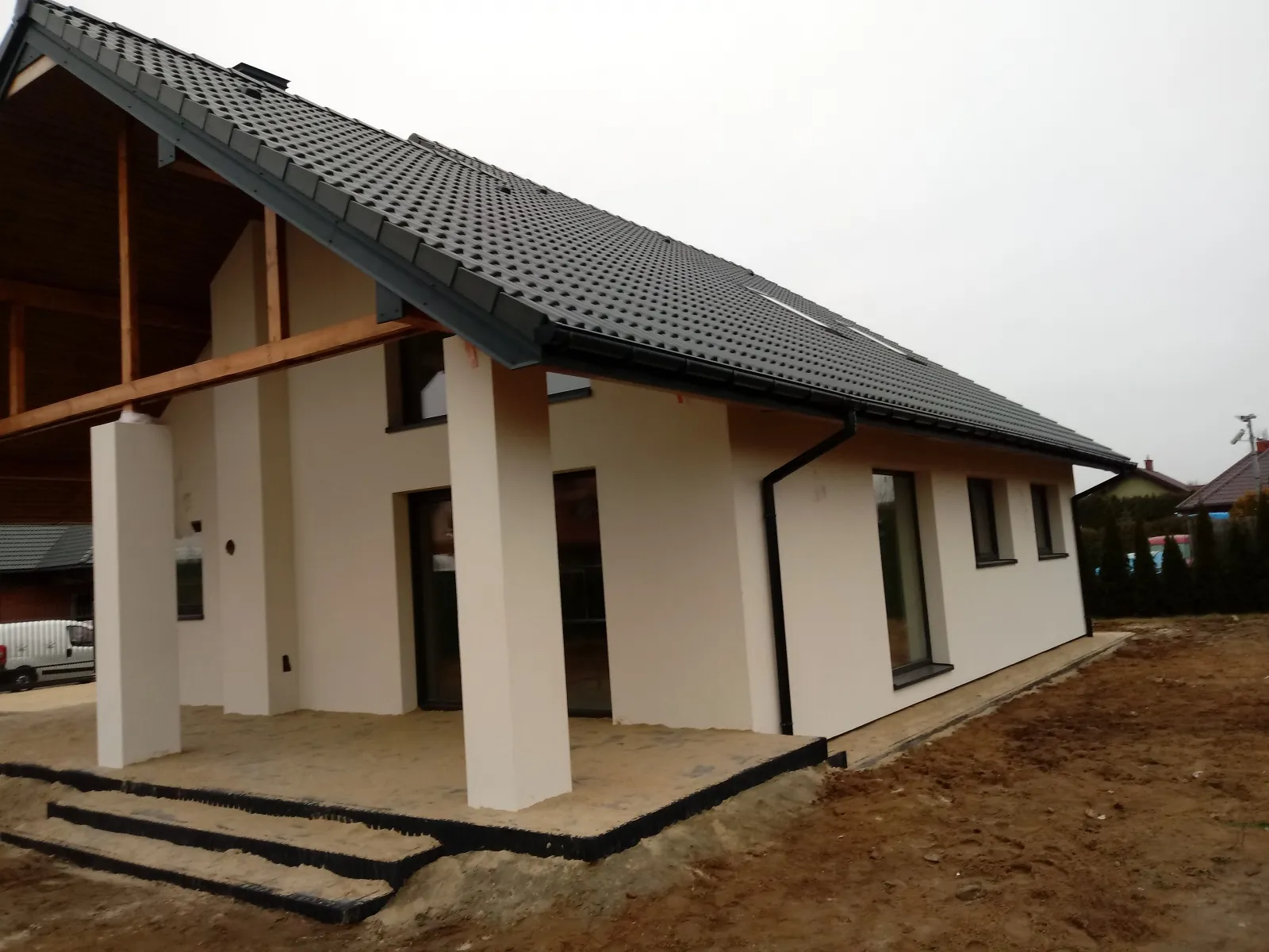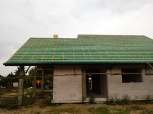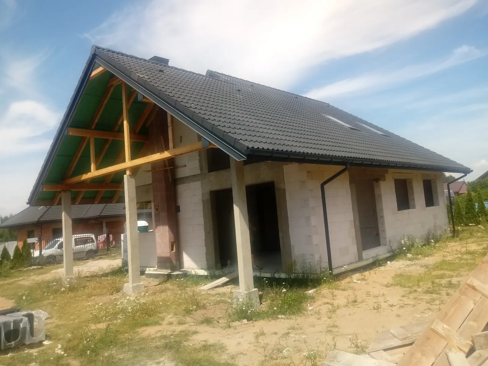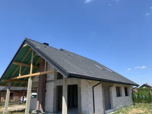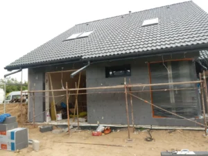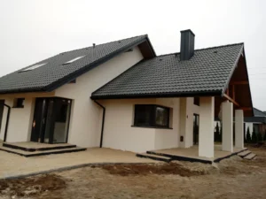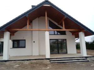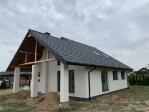 O casă cu o suprafață construită de aproape 136 m2 ridicată pe fundații tradiționale, adică benzi armate și ziduri de fundație. Pereții au fost realizați din beton celular. Planșeul peste parter este monolitic, din beton armat. Acoperișul clădirii este acoperit cu tablă cutată Pruszyński de culoare antracit.