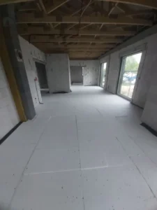 Pentru izolarea pereților exteriori a fost utilizat polistiren grafitat cu o grosime de 20 cm, iar pentru finisajul fațadei clădirii s-a folosit tencuială siliconică de culoare albă.
