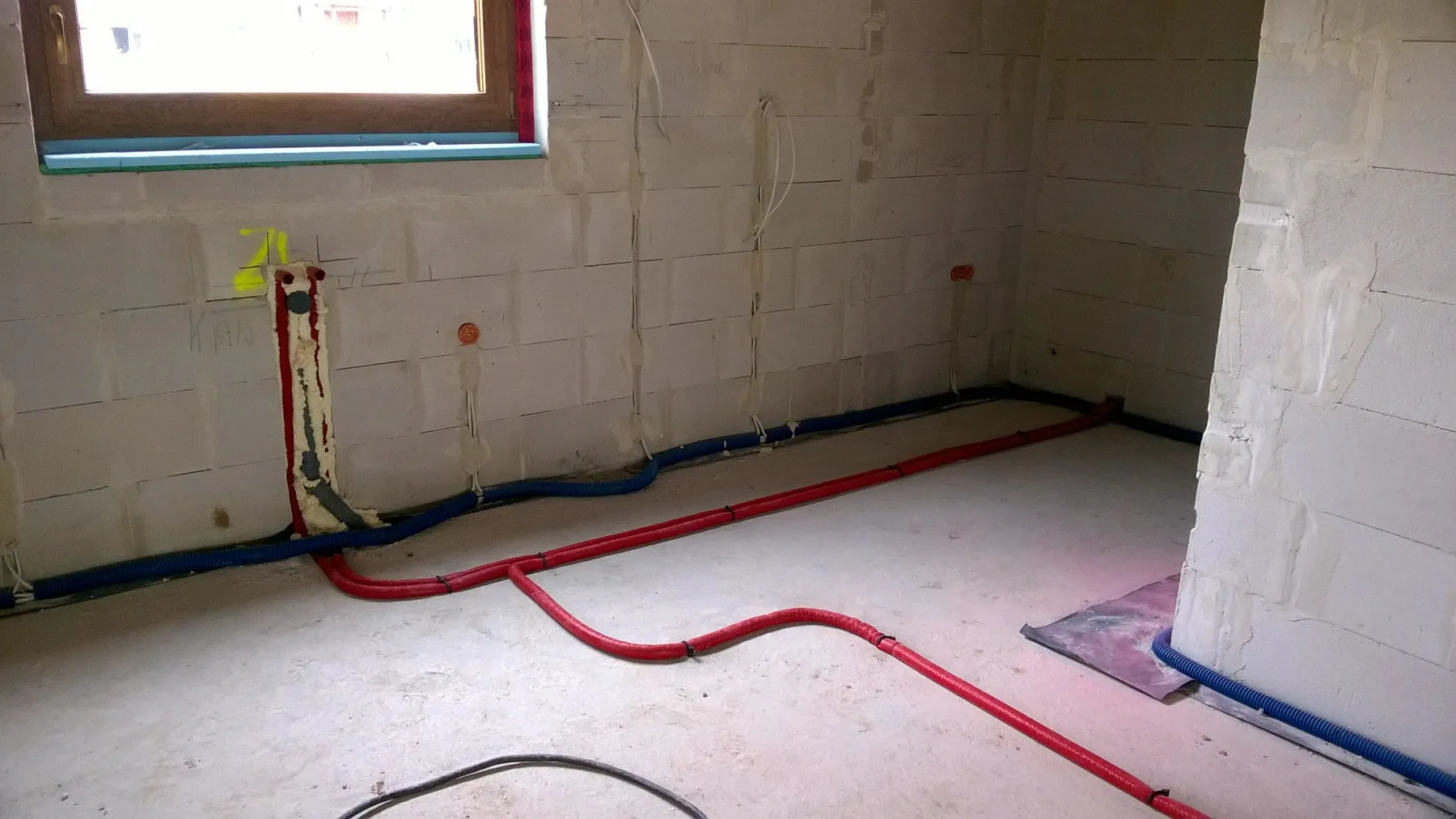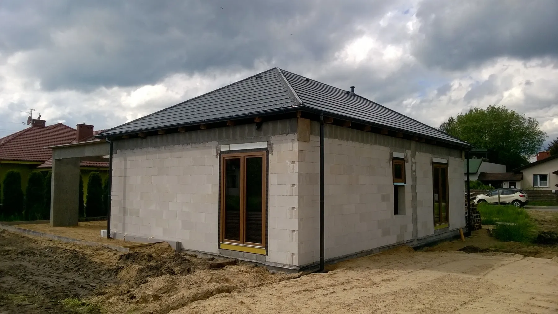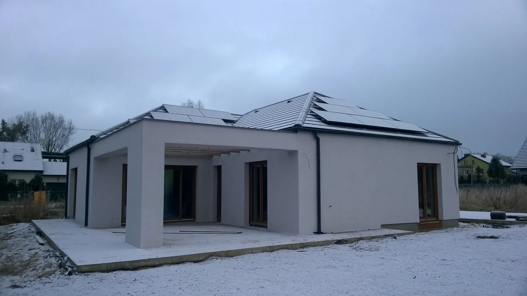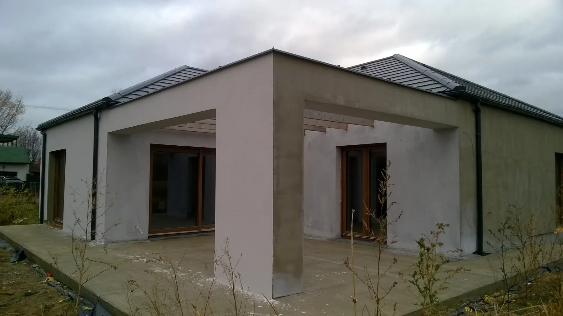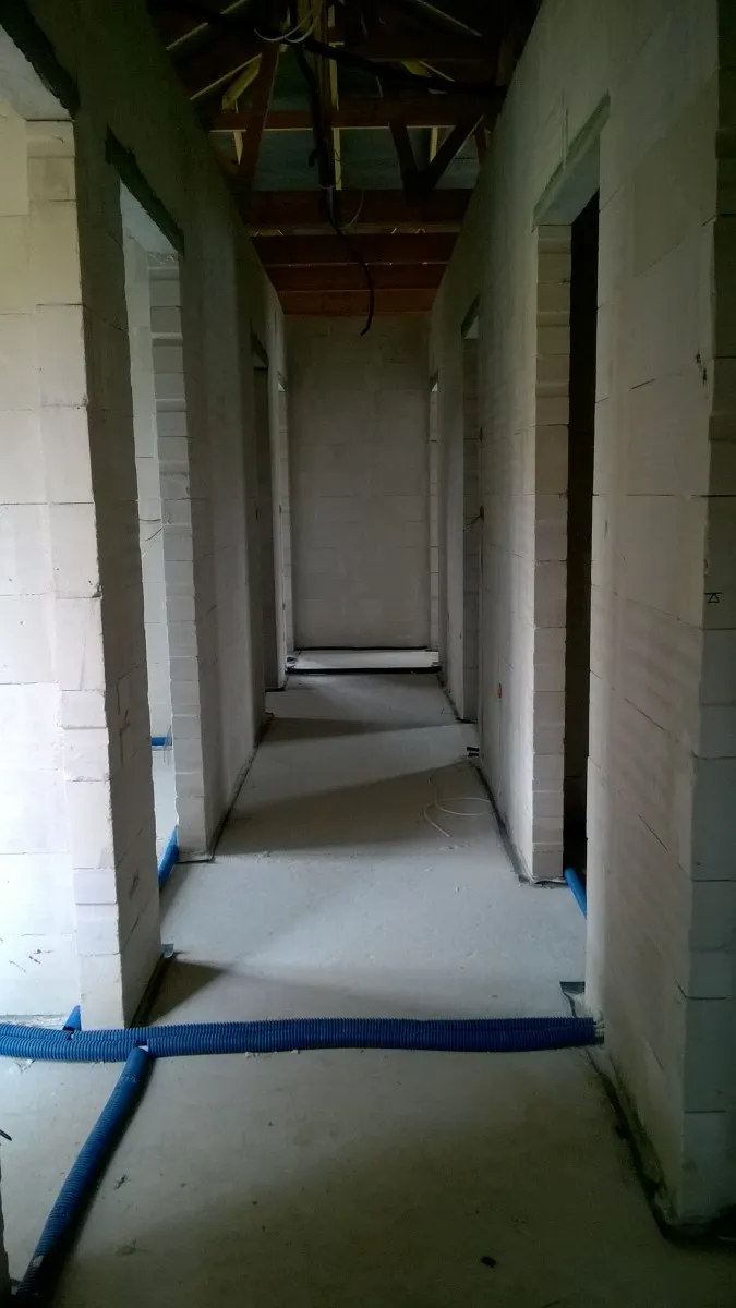După efectuarea lucrărilor pregătitoare necesare, a fost realizată o plăcuță de fundație armată cu izolație energetică din polistiren Aqua cu o grosime de 15 cm. Zidurile parterului și ale mansardei clădirii au fost zidite din beton celular. Structura acoperișului a fost realizată cu grinzi prefabricate, iar acoperișul a fost acoperit cu țiglă Braas Teviva. La montajul termoizolant al elementelor de tâmplărie pentru ferestre a fost utilizat sistemul de ferestre eficiente energetic BROS. De asemenea, s-au montat pervaze termice din XPS și plinte izolante sub ferestre pentru a asigura parametri cât mai ridicați ai montajului ferestrelor. De asemenea, au fost instalate rolete cu acționare electrică ALUPROF. Clădirea a fost dotată cu instalație electricătehnică de telecomunicațiiapă-canalizare și încălzire bazată pe sistemul de încălzire prin pardoseală electrică. A fost realizată și recuperarea căldurii – ventilație mecanică cu recuperare de căldură. Pe structura în cruce a fost montat și un plafon suspendat. În clădire s-au folosit izolații eficiente energetic, inclusiv termoizolația pereților exteriori din polistiren grafitat cu grosimea de 20 cm, iar acoperișul a fost izolat cu spumă poliuretanică (PUR) de 22 cm grosime. Fațada a fost realizată prin aplicarea unui tencuială siliconică, iar soclul clădirii a fost finisat cu tencuială mozaicată de culoare antracit.