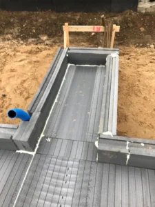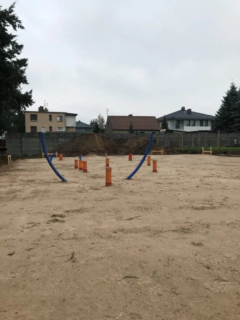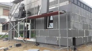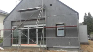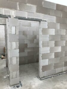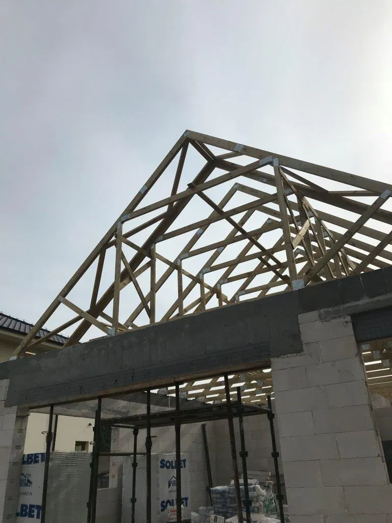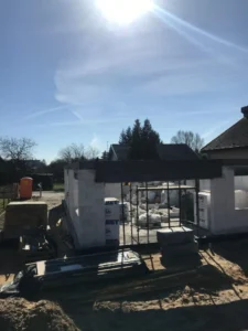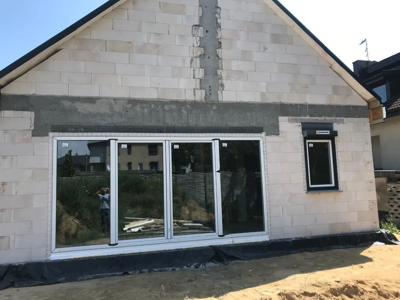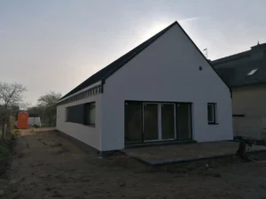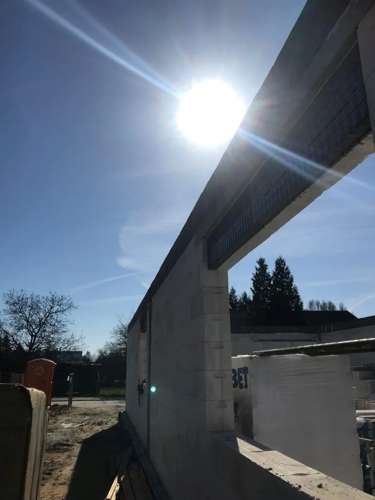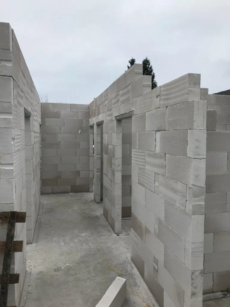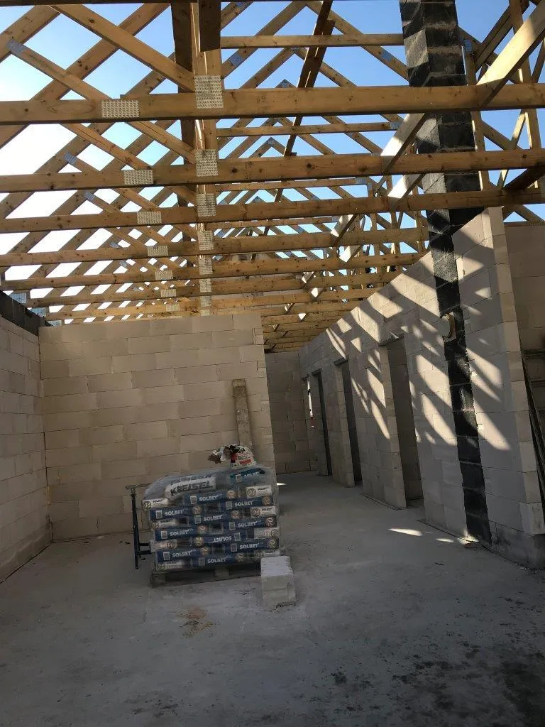 După pregătirea construcției, am început lucrările prin realizarea plăcii fundației cu izolație termică eficientă din polistiren extrudat XPS 300 de 15 cm. Pereții de susținere (grosime de 24 cm) și pereții despărțitori (12 cm) au fost realizați din beton celular folosind adeziv cu rosturi subțiri. Coșul de fum a fost realizat din elemente ceramice.