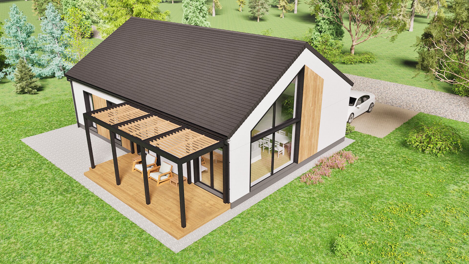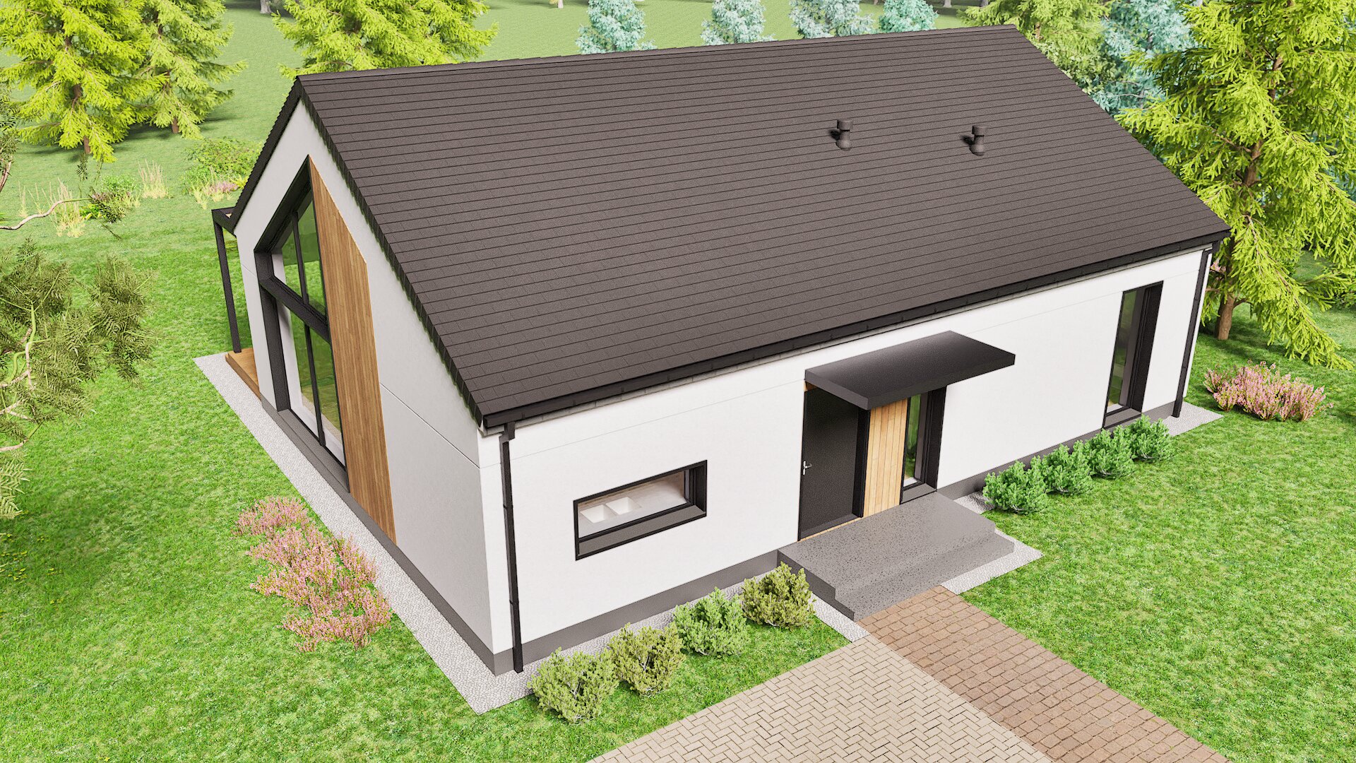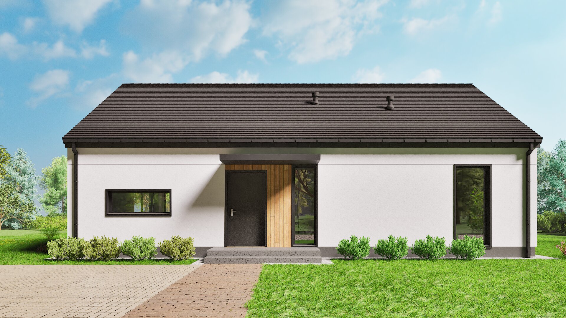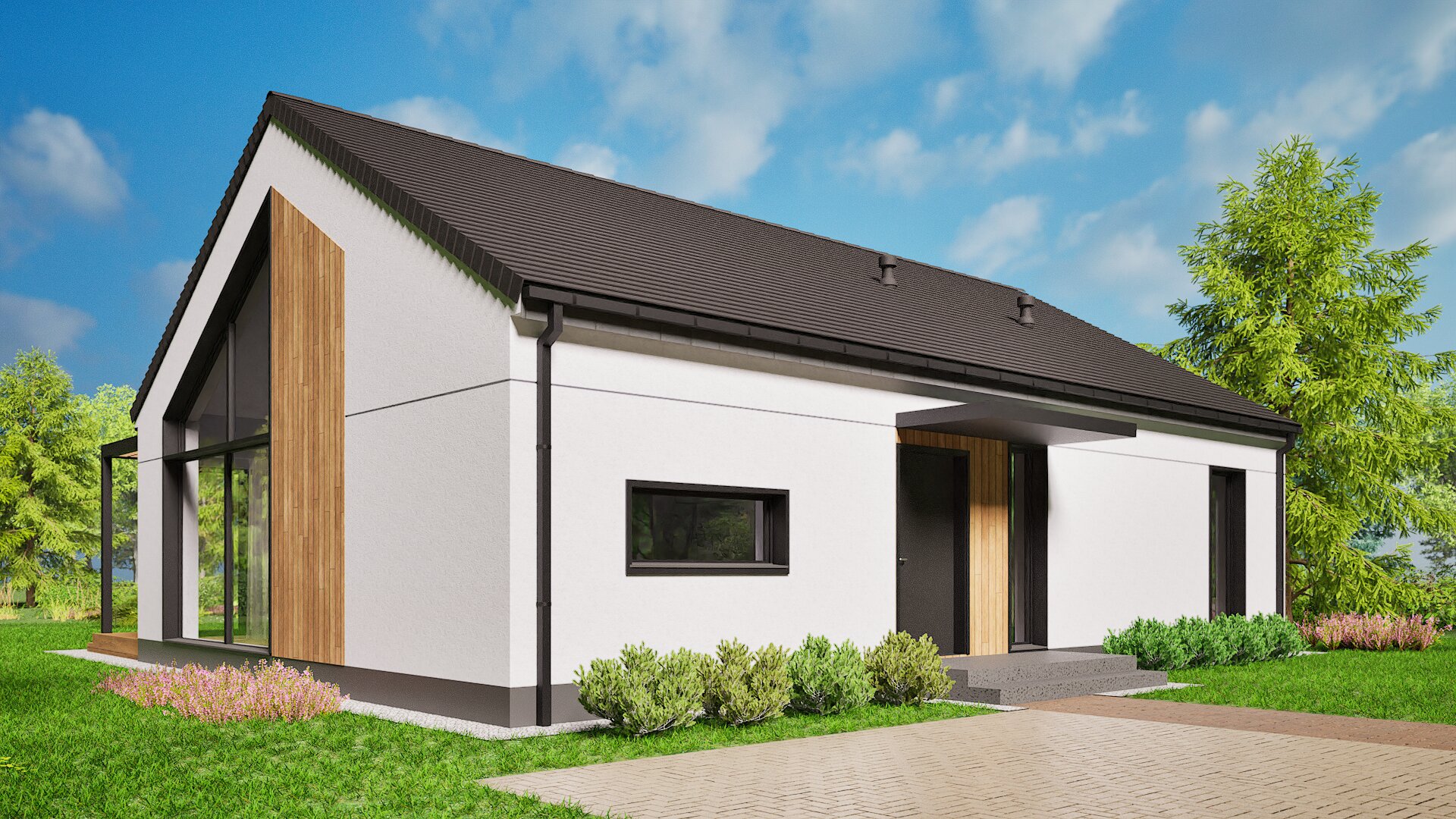 Acest proiect de casă unifamilială este soluția ideală pentru iubitorii stilului modern și a soluțiilor arhitecturale practice. Casa se remarcă printr-un volum simplu, care combină armonios estetica minimalistă cu funcționalitatea. Elementul cheie al proiectului este tavanul înalt tip catedrală, care creează un spațiu plin de lumină și aer, conferind interiorului un caracter unic. Ferestrele mari din față oferă o priveliște minunată spre grădină și fac ca încăperile să devină luminoase și spațioase.