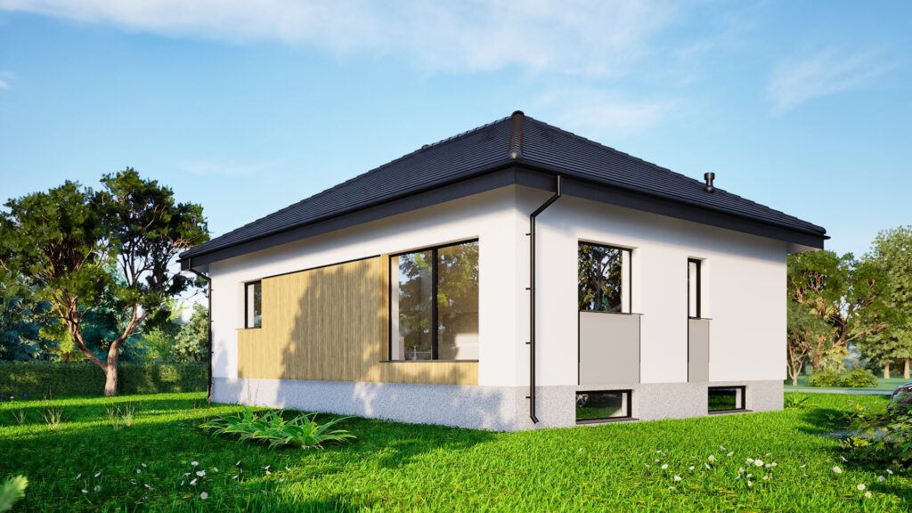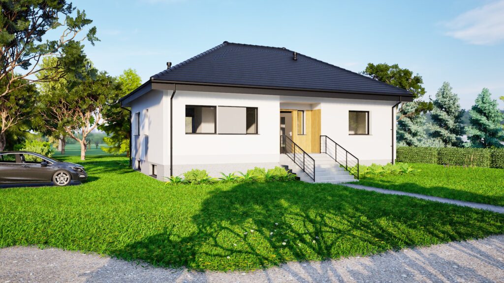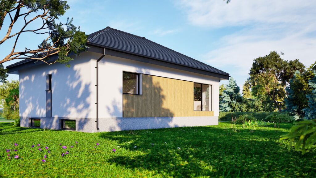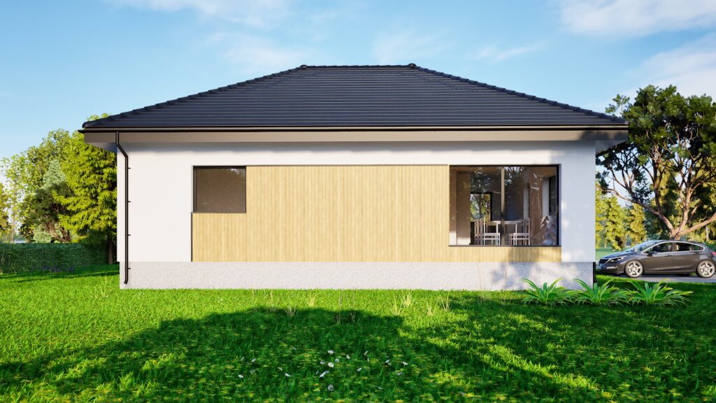 Acest proiect este o casă modernă parter, ideală pentru o familie care caută o soluție funcțională și estetică. Clădirea, cu o formă compactă și dreptunghiulară, combină un aspect clasic cu accente moderne. Fațada este luminoasă, cu panouri din lemn, care îi conferă eleganță și un aspect natural. Acoperișul în șarpantă asigură un caracter tradițional, iar geamurile mari aduc multă lumină naturală în interior, sporind confortul utilizării.