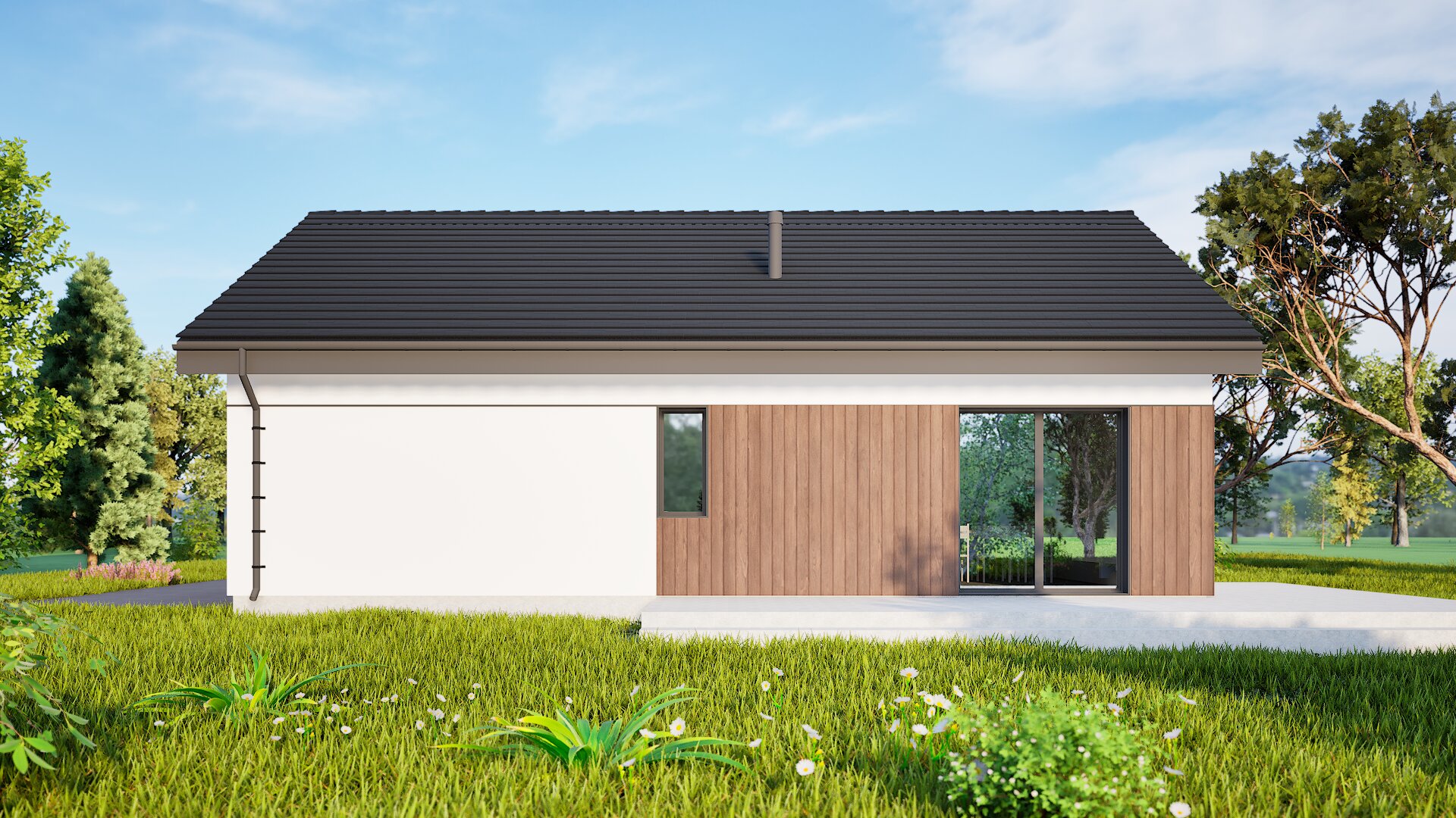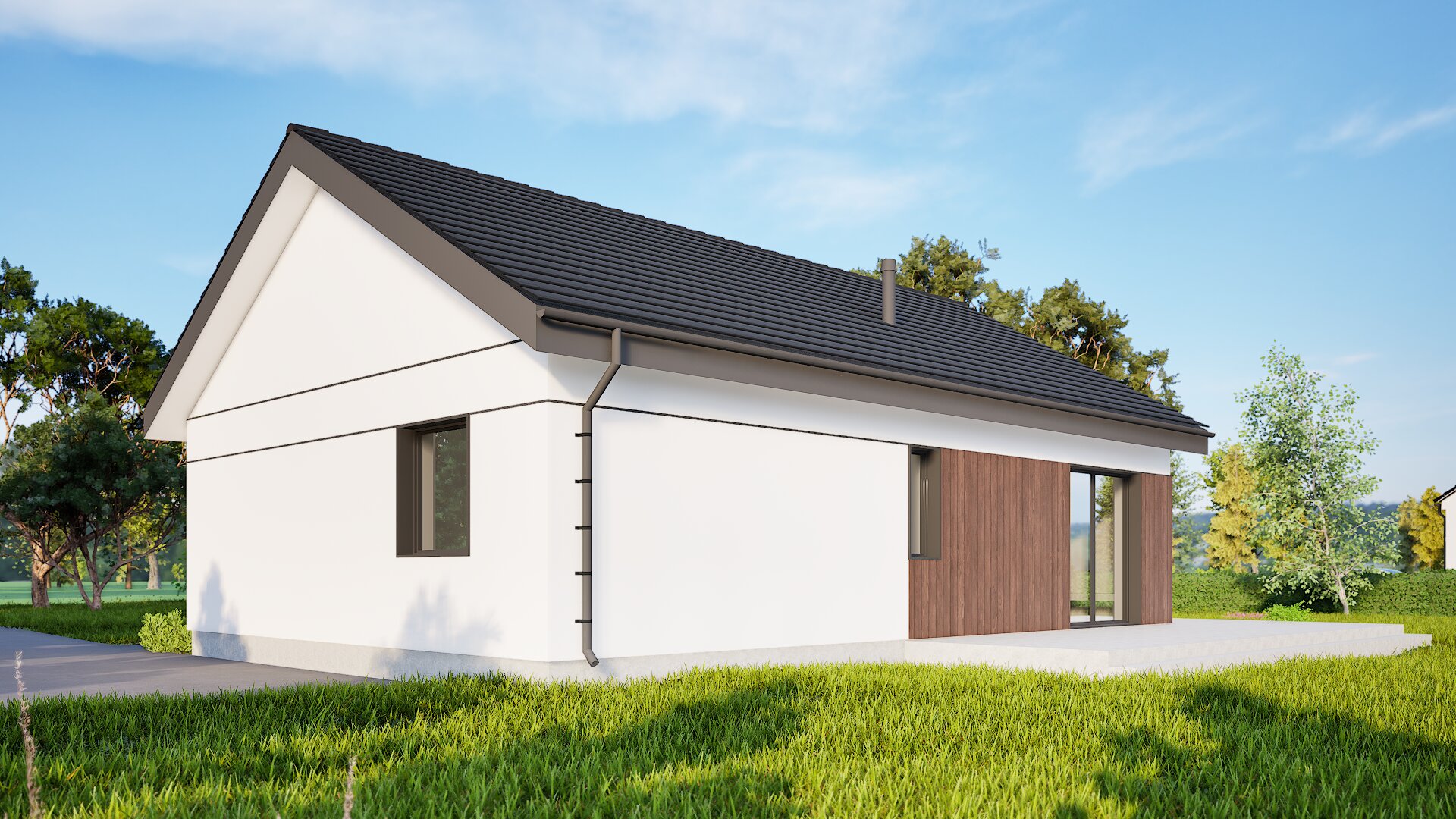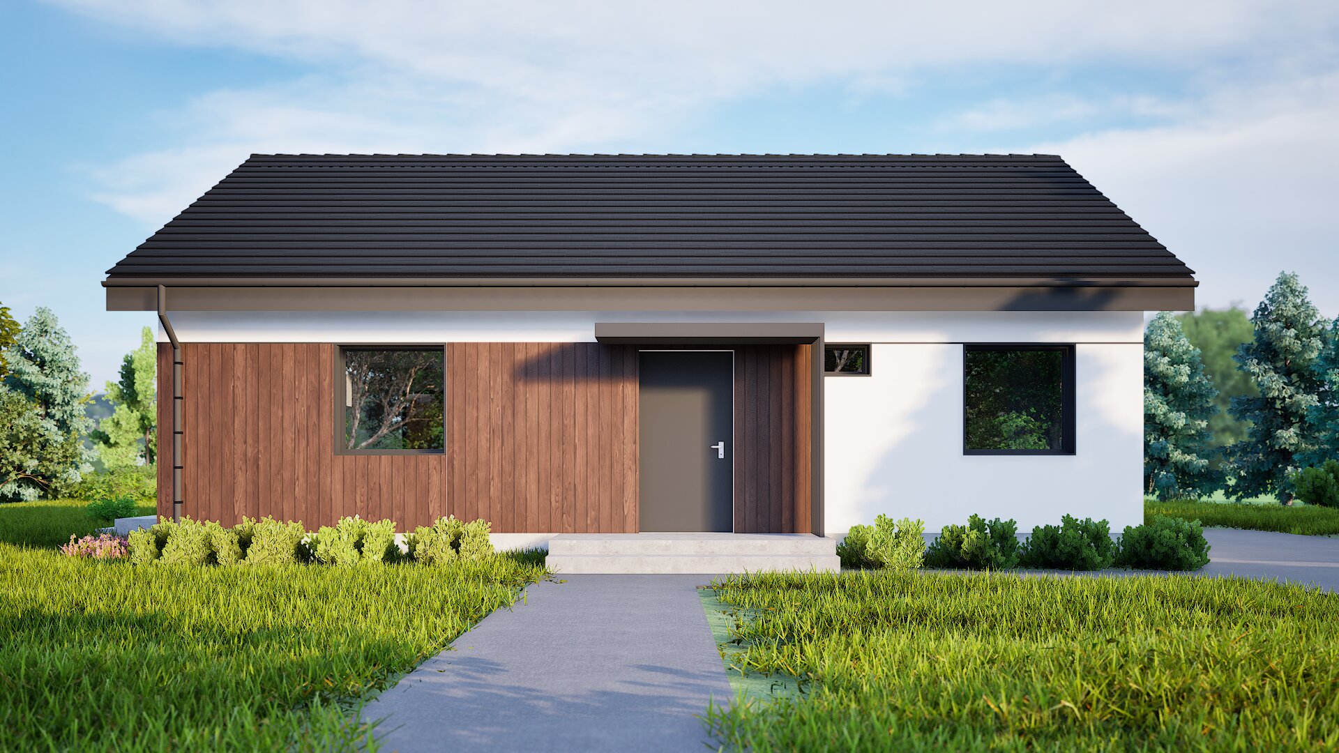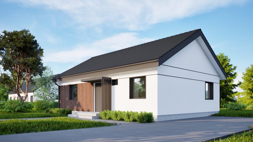 Proiectul PRO 15 este o casă unifamilială modernă și compactă, cu o formă simplă, care se potrivește perfect nevoilor unei familii mici. Caracteristica sa principală este estetica minimalistă, care combină forma tradițională a acoperișului în două ape cu detalii moderne ale fațadei. Fațada clădirii este luminoasă, cu accente din lemn, care adaugă căldură și naturalețe. Marii geamuri asigură o iluminare excelentă a interiorului, creând un spațiu luminos și primitor.