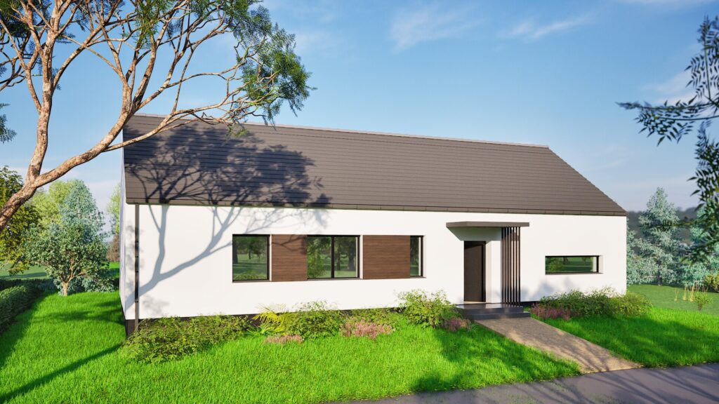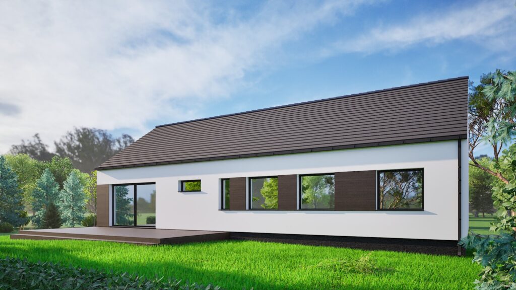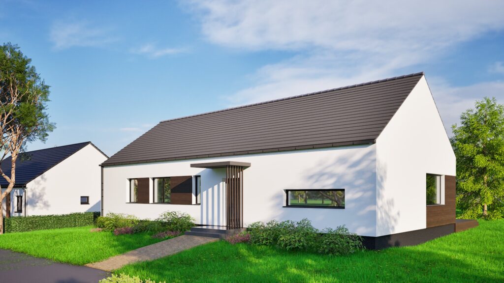 Proiectul casei prezentate este o clădire parter modernă, minimalistă, cu un volum simplu și elegant, având un acoperiș în două ape. Fațada clădirii este menținută într-o nuanță clasică de alb, cu accente întunecate din lemn în jurul ferestrelor și ușii de intrare, ceea ce îi conferă un aspect contemporan și stilat. Simplitatea formei și funcționalitatea acestui proiect îl fac o soluție ideală pentru familiile care caută o casă confortabilă și modernă, cu costuri reduse de exploatare.