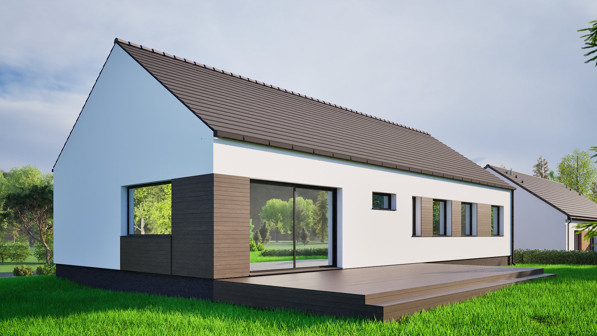 Ferestrele panoramice mari din living asigură o iluminare excelentă a interiorului, permițând totodată admirarea naturii înconjurătoare. În spatele casei se află o terasă spațioasă, care este perfectă pentru relaxare în aer liber. Intrarea în casă este accentuată printr-un element modern de protecție din lemn, care oferă adăpost de ploaie și vânt, adăugând în același timp eleganță.