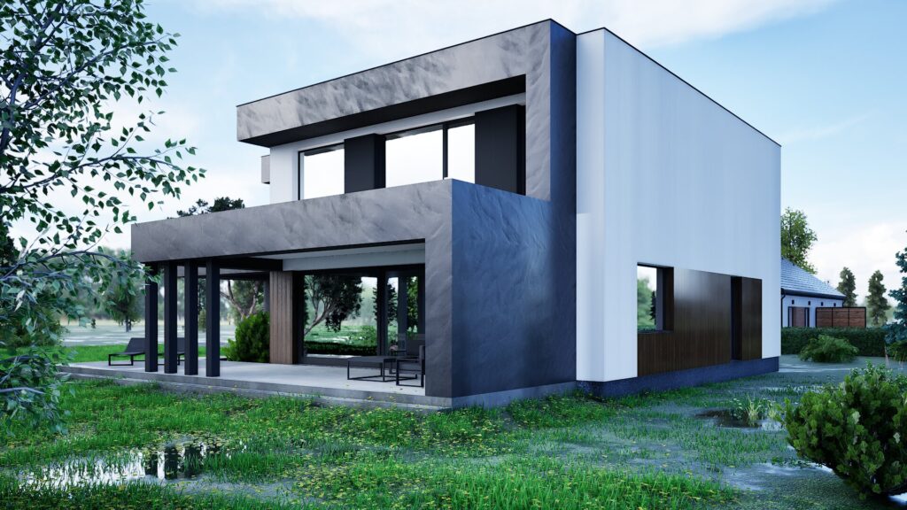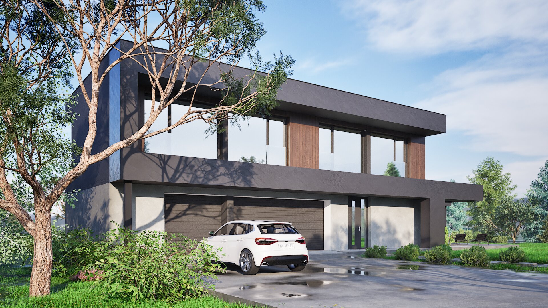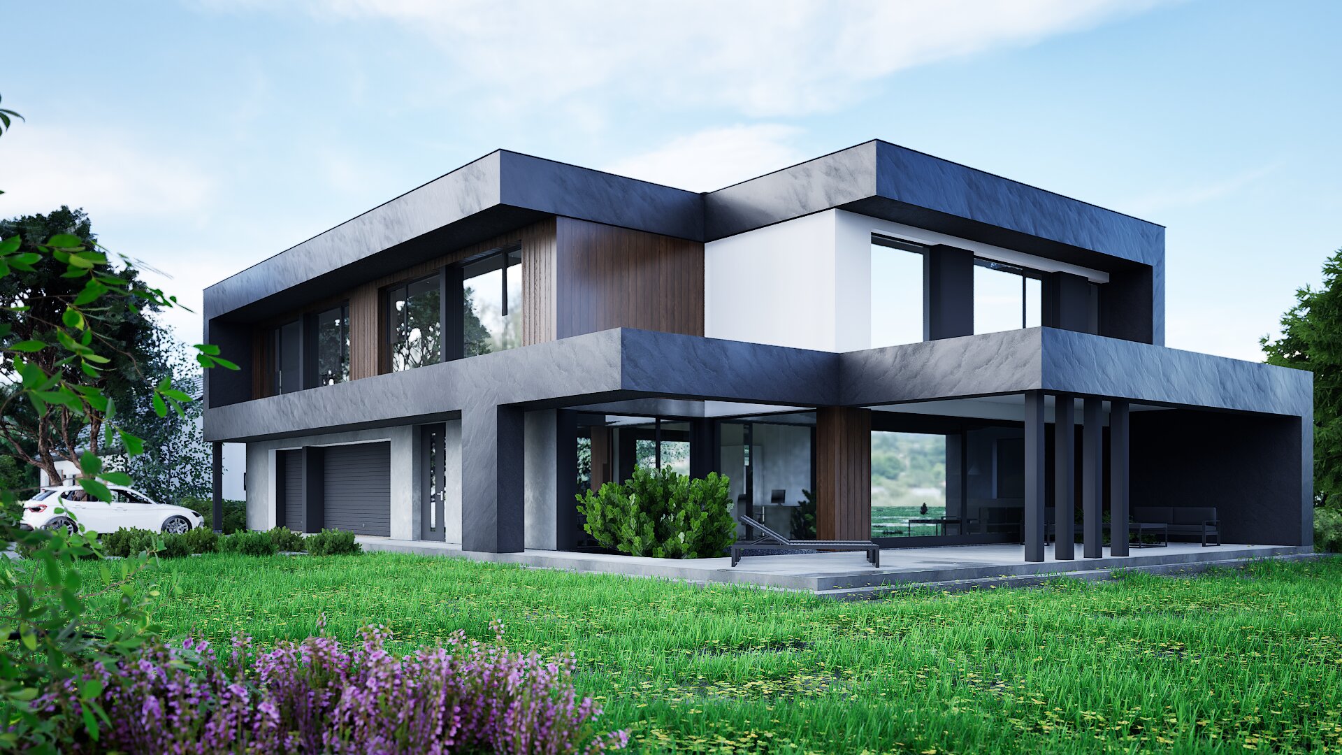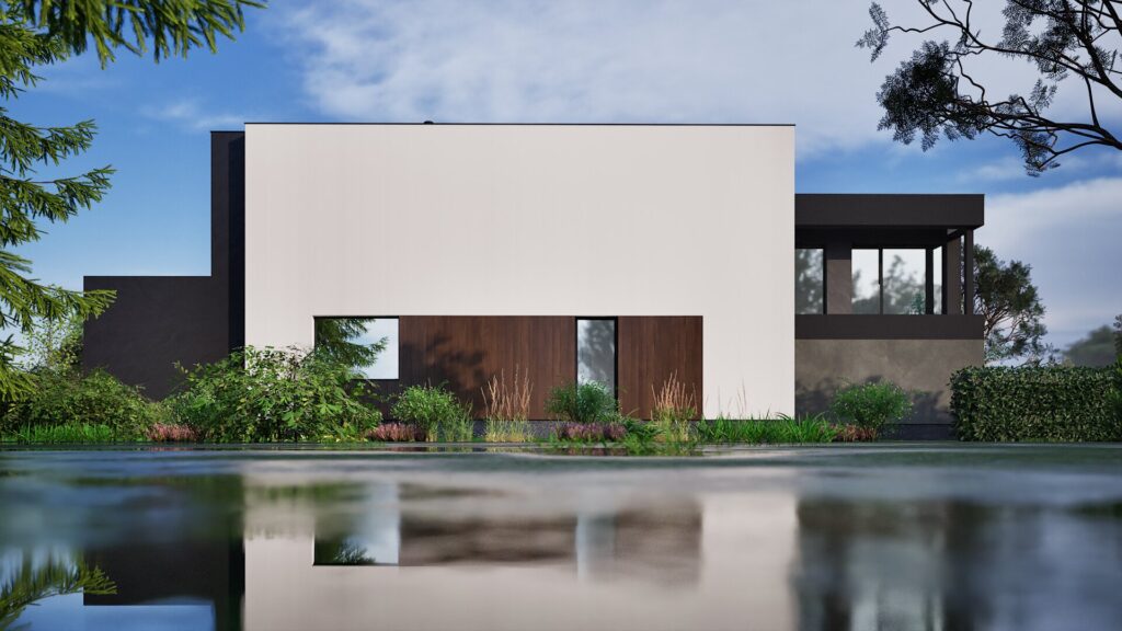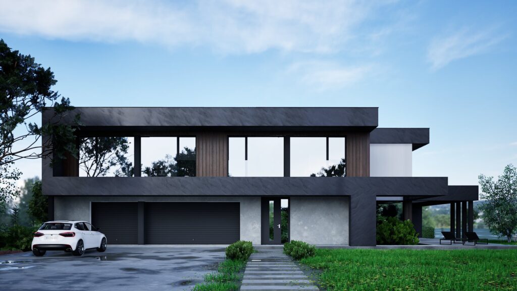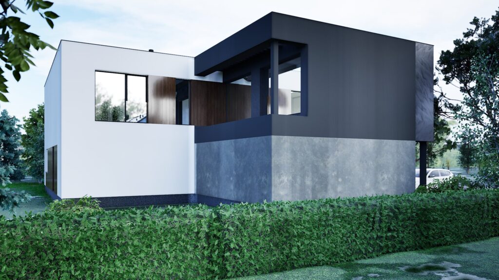 Proiectul casei prezintă o clădire modernă, spațioasă, cu forme simple și elegante, care se potrivește perfect nevoilor familiilor contemporane. Dispunerea pe două niveluri oferă spații interioare largi, cu ferestre mari, care asigură iluminare naturală și contact direct cu mediul înconjurător. Casa se remarcă printr-o formă geometrică minimalistă, dominată de linii drepte și combinația de elemente întunecate și luminoase ale fațadei. Utilizarea materialelor moderne, cum ar fi tencuiala structurată și plăcile de fațadă, conferă proiectului un caracter distinct și un aspect contemporan.